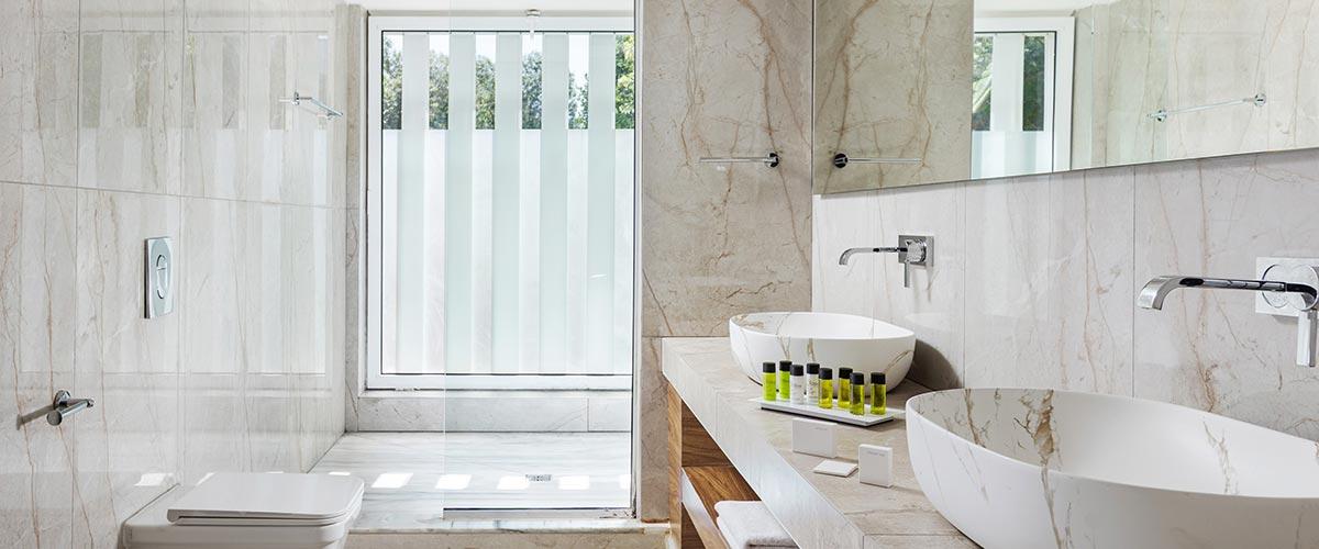 - Marble spa bathroom with chromotherapy, built-in 50x50cm pressurized rain shower cabin with jacuzzi jets, branded toiletries, bathrobes and slippers