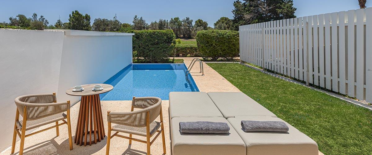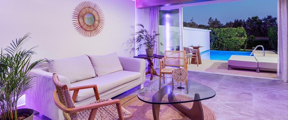 Located on the pool level, this elegant suite combines comfort and exclusivity, featuring a separate bedroom and living area for privacy and relaxation. The private pool offers a serene retreat, while the sleek design, ambient lighting, and refined details create a modern and luxurious atmosphere.